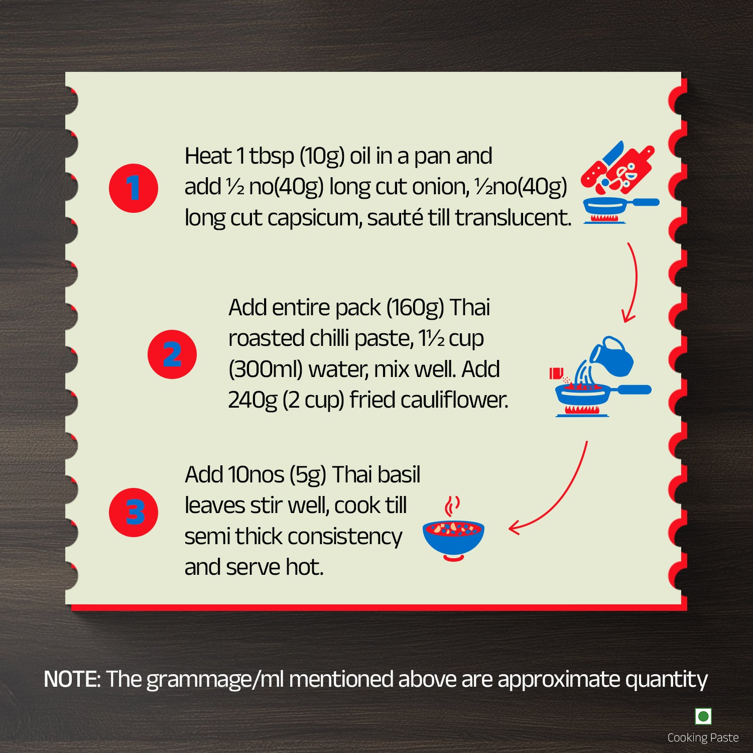 Add entire pack (160g) Thai roasted chilli paste, 1½ cup (300ml) water, mix well. Add 240g (2 cup) fried cauliflower.